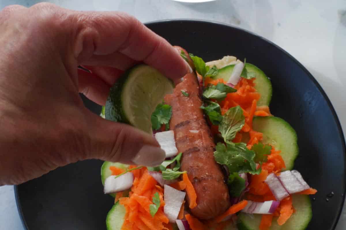 - Step 4: Squeeze lime wedge over turkey dog and veggies and herbs, dividing by all 4.