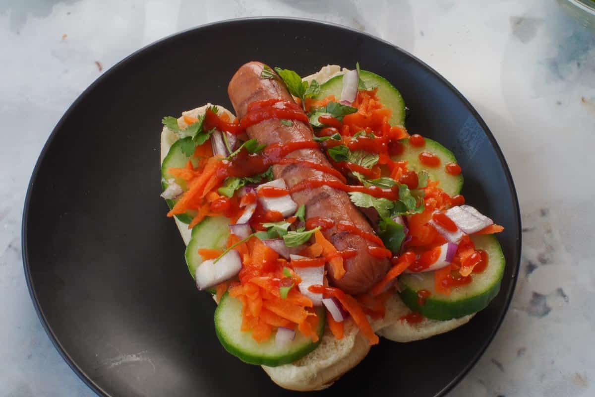 - Step 3: Add cucumber, grated carrot, red onion, and herbs to bun, dividing between all 4 buns . Add a turkey hot dog to hot dog bun. Drizzle vinegar/sugar mixture over turkey dogs. Then drizzle sriracha sauce over turkey hot dogs (as much as desired). *I only use a little as it's spicy!