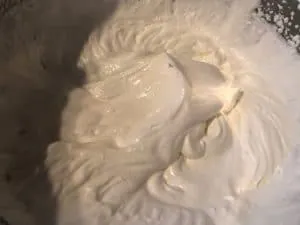- Before serving (or in advance), beat whipping cream to soft peaks, add the white granulated sugar and then beat to stiff peaks.