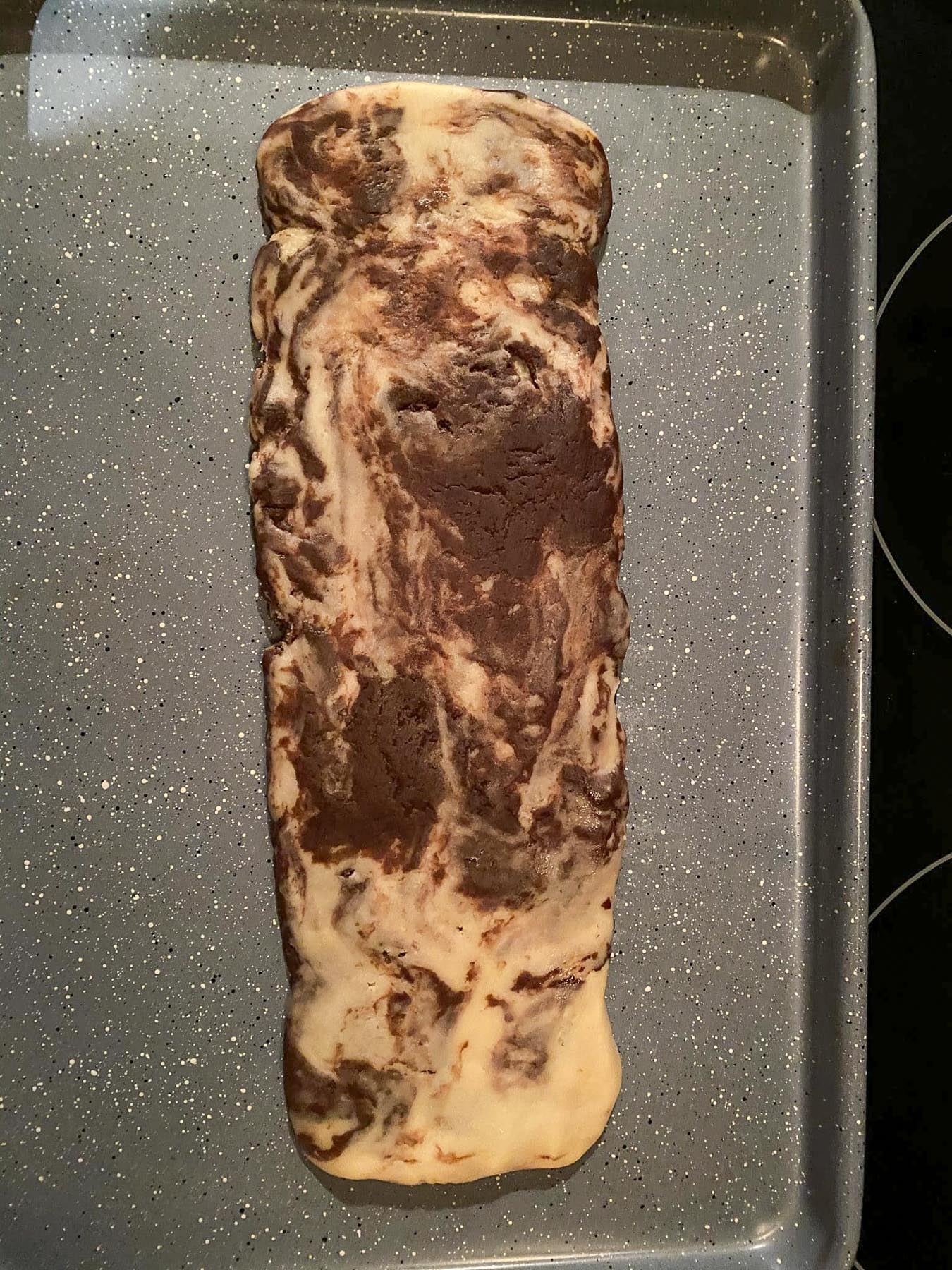 It all starts with one simple biscotti vanilla dough that's then divided so that half of it can be made into a chocolate biscotti dough. From there, it's just blended to get the marbled effect.