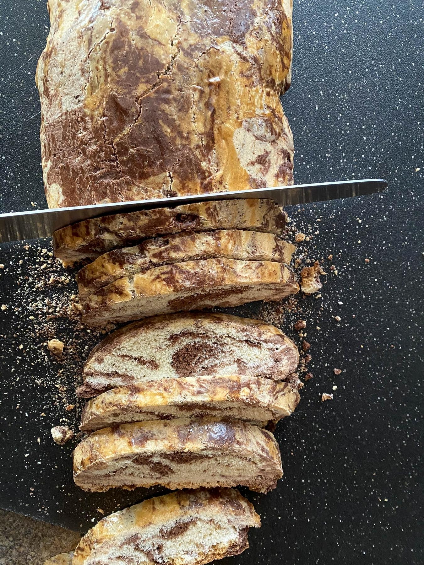 - Use a serrated knife and cut on an angle. You'll want to cut this marbled biscotti on an angle, with a serrated knife. I use a serrated bread knife. I've just found it to be the best way to cut biscotti, and the King Arthur Baking company agrees -they list the technique as one of their 'secrets' of great biscotti.