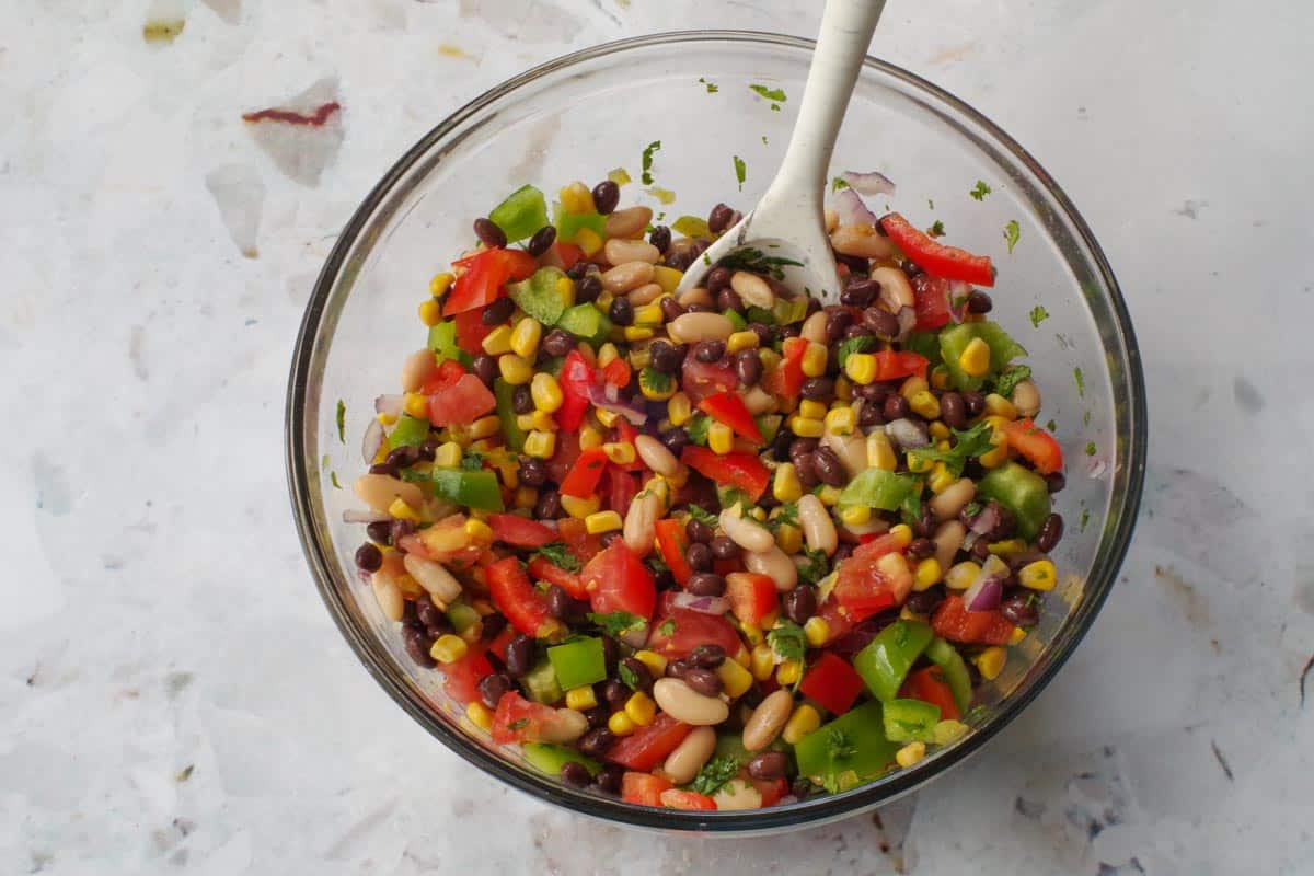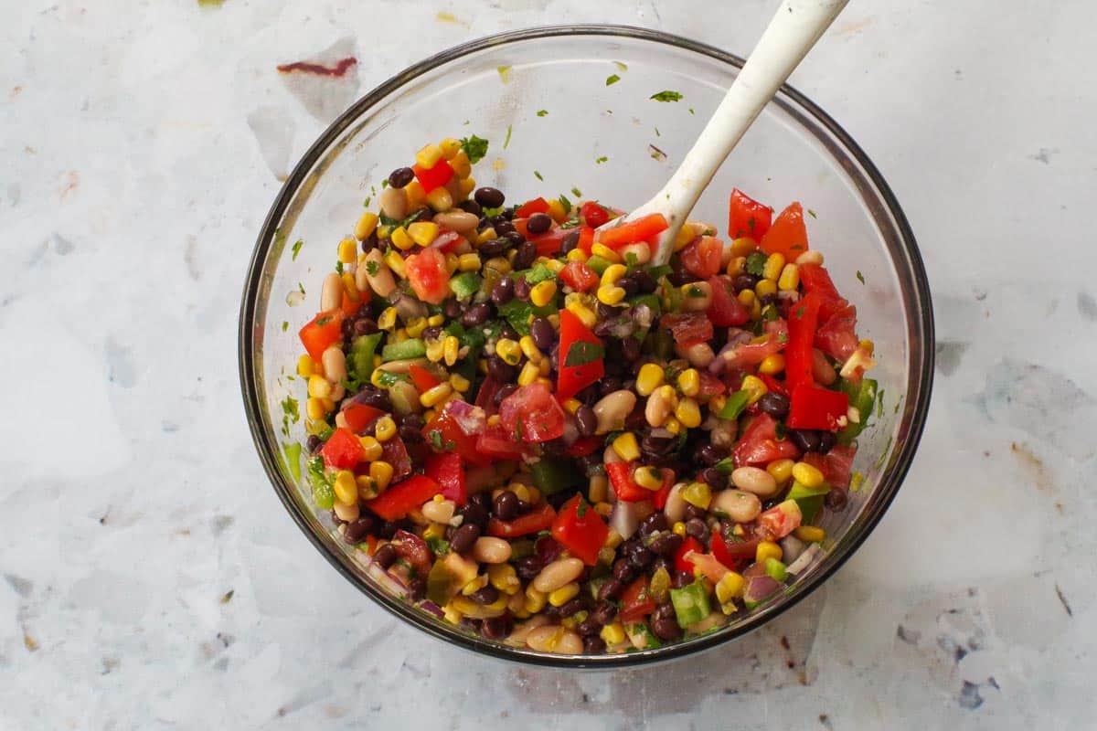 - Combine tomatoes, onion, black beans, Cannellini beans, corn, peppers, jalapeno peppers, and cilantro in a large bowl. Toss/stir well so that ingredients are well-combined.3 Roma tomatoes, diced, ⅓ cup red onion, chopped, 341 ml canned corn, drained and rinsed, 540 ml black beans, drained and rinsed, 398 ml can white Cannellini beans, drained and rinsed, 1 green bell pepper, diced, 1 red pepper, diced, 3 tablespoon jalapeno peppers, chopped, ⅓ cup fresh cilantro, finely chopped