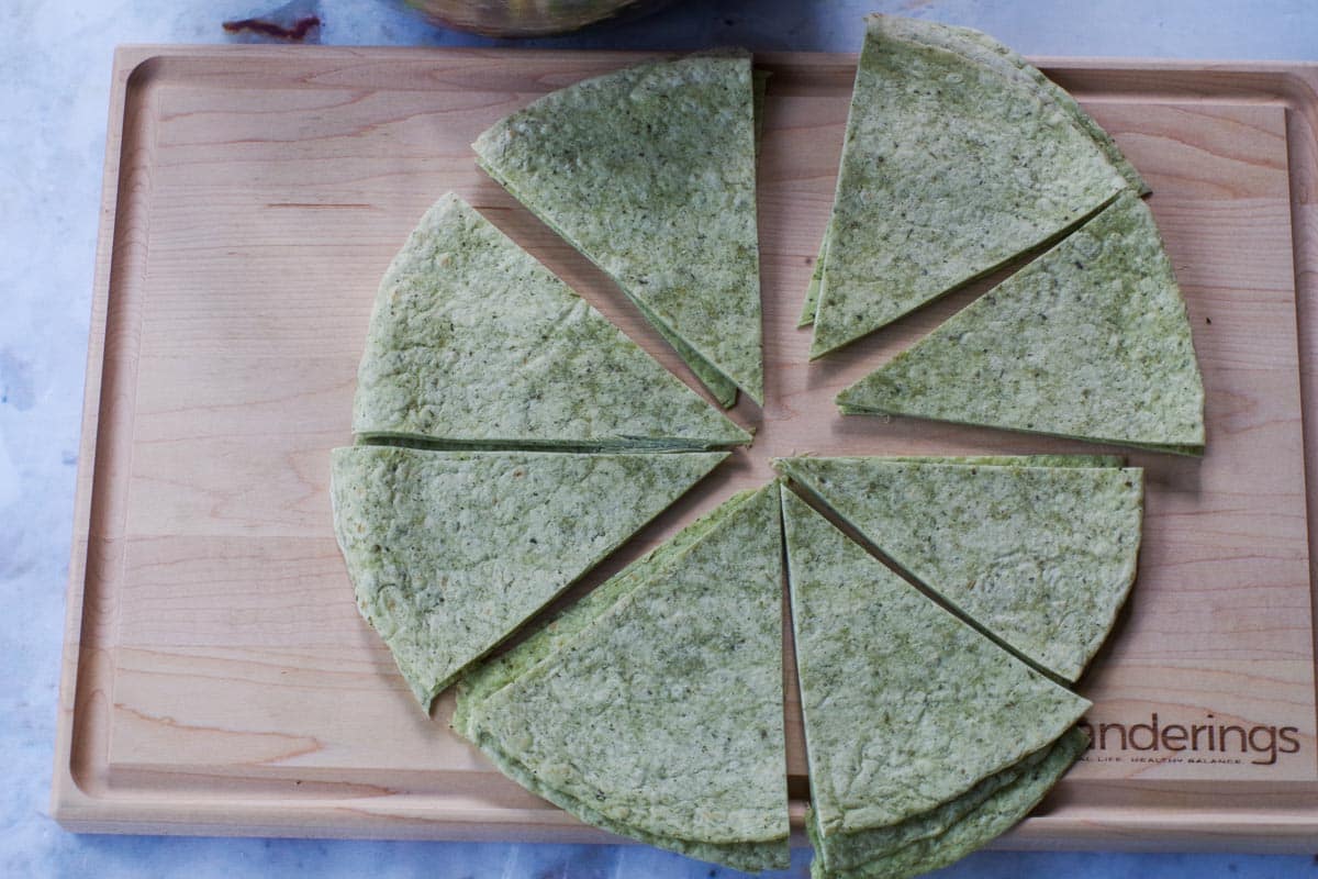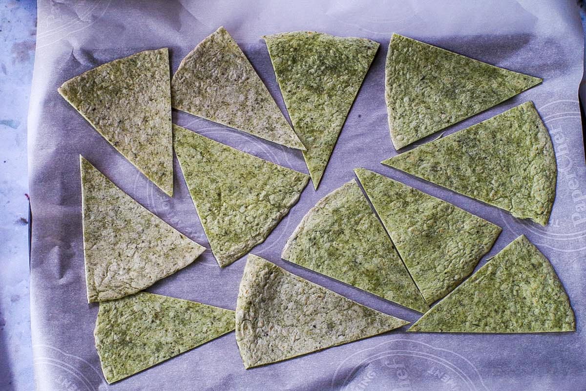 - Step 4: Preheat oven to 400 degrees F/204 degrees C. Spray a baking sheet with non stick cooking spray or line with parchment paper. Stack tortillas and cut into 6 triangles.