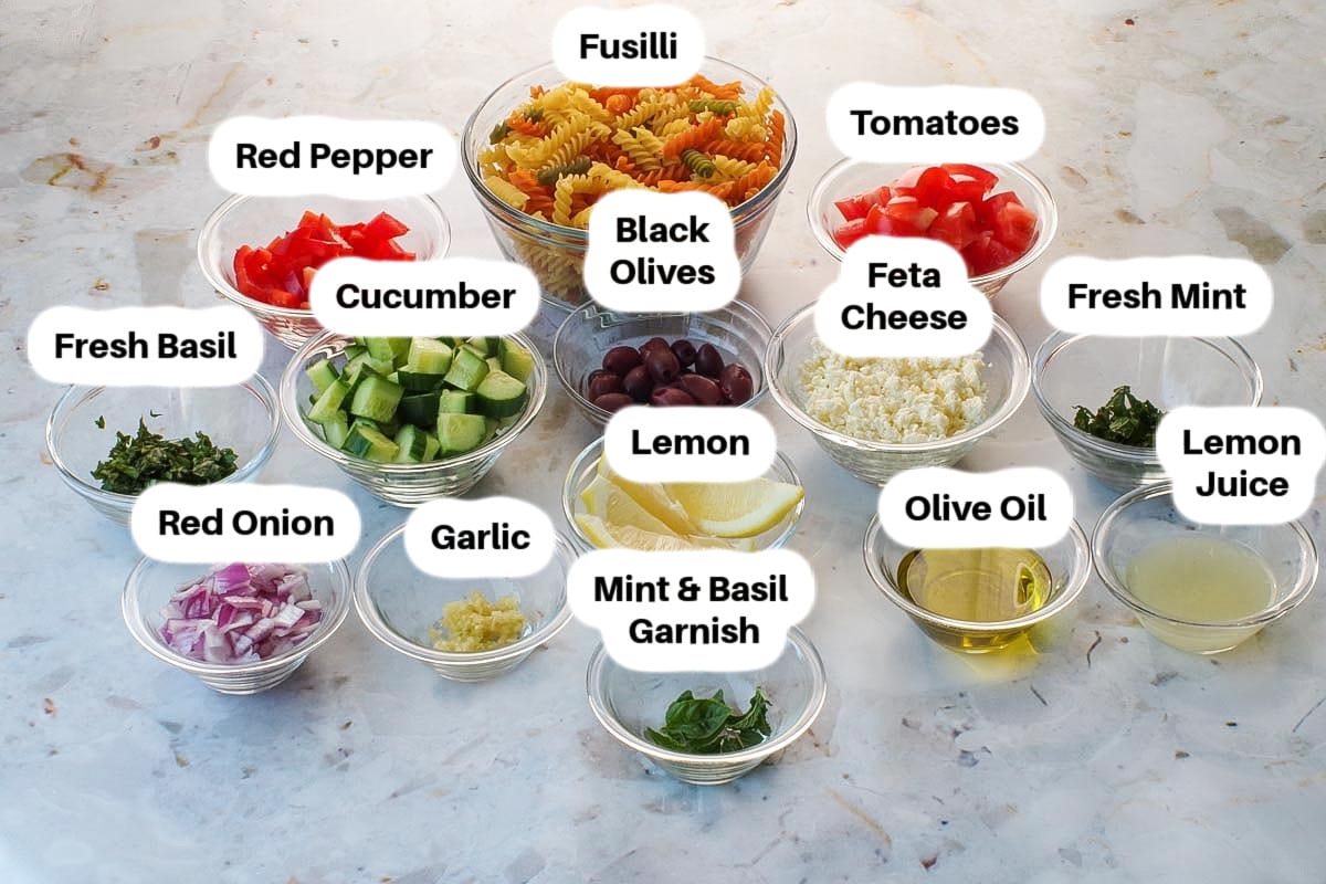 What I love about this cold pasta salad recipe is how healthy and simple the dressing is, and it's loaded with fresh vegetables and herbs! It's also made with real ingredients. All you need for this Greek salad dressing is: