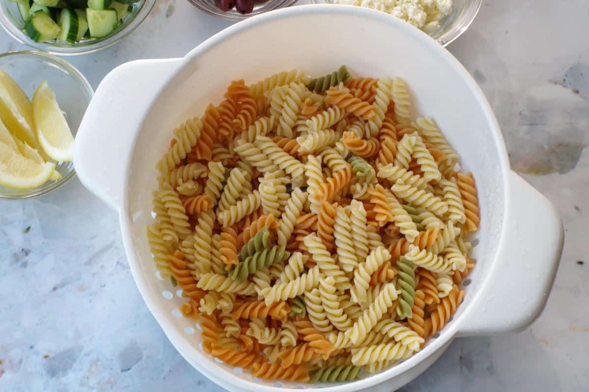 - Cook pasta in water (as per package directions) until tender (al dente), but still firm. Drain. Put in the fridge to cool while preparing the rest of the ingredients. If you are in a hurry, run the pasta under cold water before placing in the fridge to speed up the cooling time.