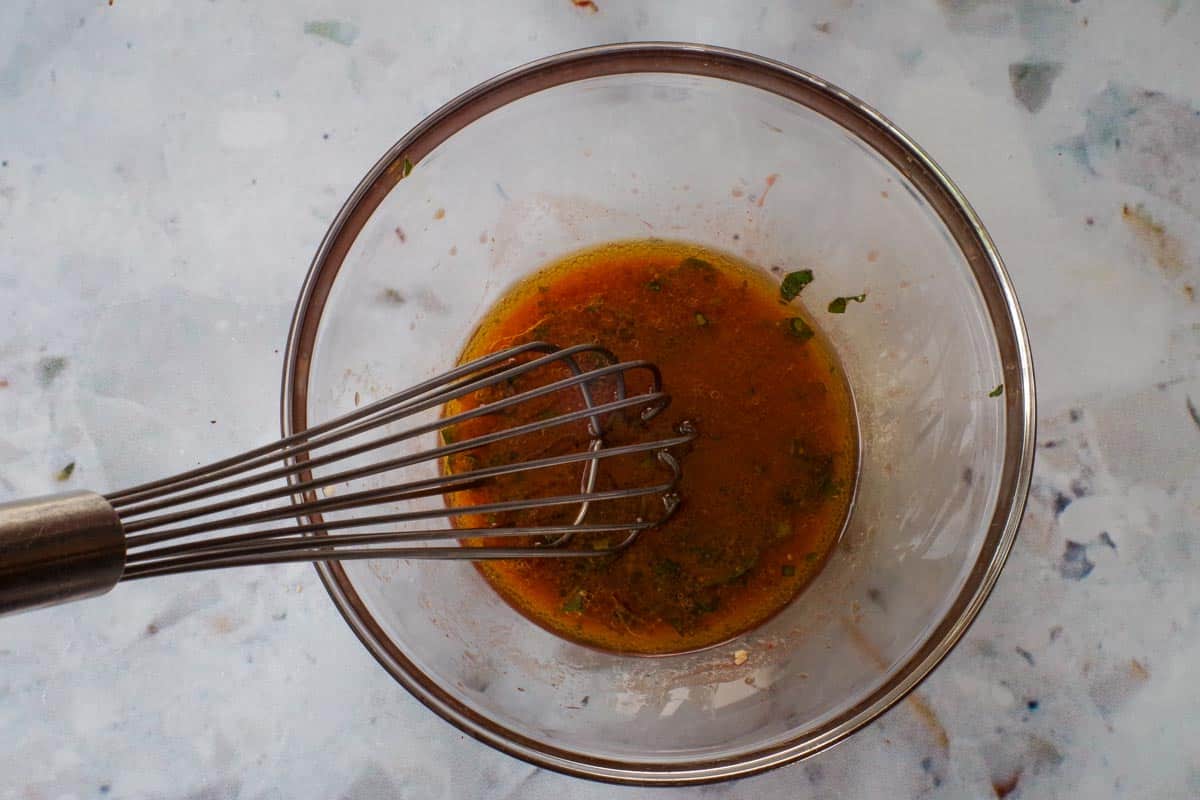 - Whisk remaining dressing ingredients together with reduced Clamato juice and slowly add olive oil. Serve over salad, as much as desired.¼ cup red wine vinegar, 1 teaspoon chopped basil, 1 clove minced garlic, 1 tablespoon finely grated onion, 2 teaspoon Dijon mustard, ¼ cup olive oil