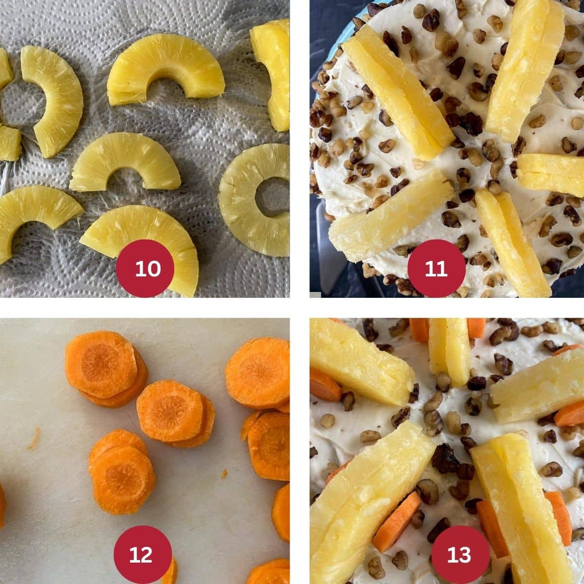 DECORATE THE CAKE (STEP 4 ): Add chopped walnuts to the side of the cake (I did this by literally 'throwing them' at the side of the cake. Then add to top. * This is optional. Pat dry pineapple rings and cut them in half. Make sure they are dried well (IMAGE 10). Add 2 pineapple halves, pressed together to the top of the cake - you'll need 5 sets of 2 (IMAGE 11). Cut carrots into circles (IMAGE 12). Add a slice of carrot to each side of the pineapple (IMAGE 13). Serve or refrigerate until ready to serve.