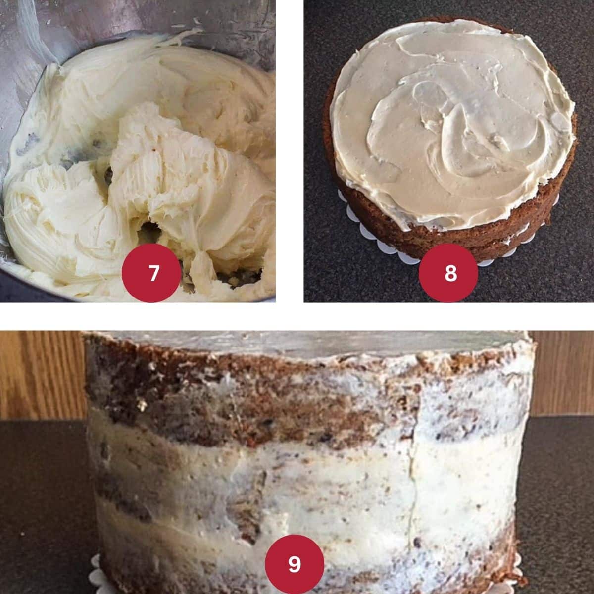 MAKE THE FROSTING & FROST THE CAKE (STEP 3): In a large mixing bowl, combine cream cheese, icing sugar, and vanilla; beat with an electric hand mixer until smooth and creamy. (IMAGE 7). Place the first cake layer on an 8-inch cardboard cake circle (for easy transport). If you plan to move it or place it on the surface you plan to serve it on. Then add some cream cheese icing/frosting as filling. You don't want to use very much, as it's rich and you need to keep most of it to frost the cake. Then add the second cake layer and repeat (IMAGE 8). Add the third cake layer.*HINT: Before you start to decorate, take a pastry brush and dust off any crumbs on the cake. Crumb coat the cake and freeze for 10 minutes: Add a very thin layer of frosting (as shown) to the cake and smooth. Do NOT leave in the freezer any longer than 10 minutes.** You don't have to do this, but I do find it makes it easier to frost, especially if you want to avoid getting crumbs mixed in the icing! Frost/Ice the Cake: Spread the remainder of the icing evenly on the cake (IMAGE 9).* CLICK HERE FOR VIDEO: How to Frost/Ice Carrot Cake