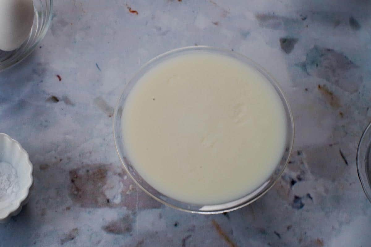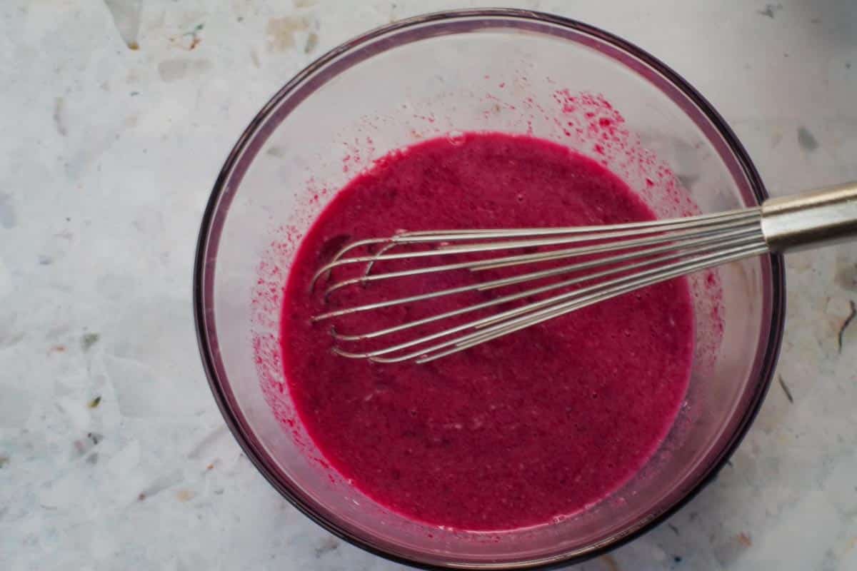 - In a large bowl, mix eggs, milk mixed with vinegar, granulated sugar, vanilla extract, and pureed beets.
