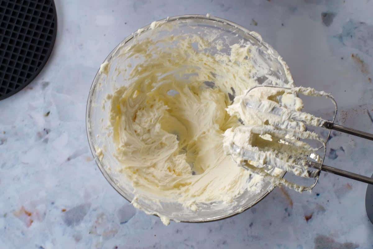 - With an electric mixer, whip butter and cream cheese together for 3-5 minutes until smooth, scraping sides to ensure proper blending.
