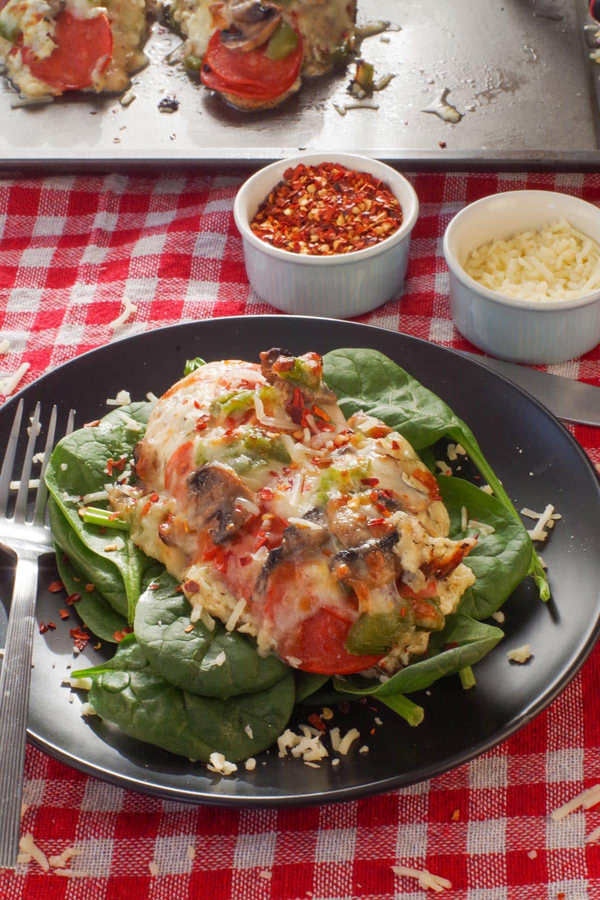 - Fresh Veggies: Sliced mushrooms and green peppers help you hit your 5-a-Day goals effortlessly. They are roasted with the chicken to save time. This also avoids a soggy pizza chicken.