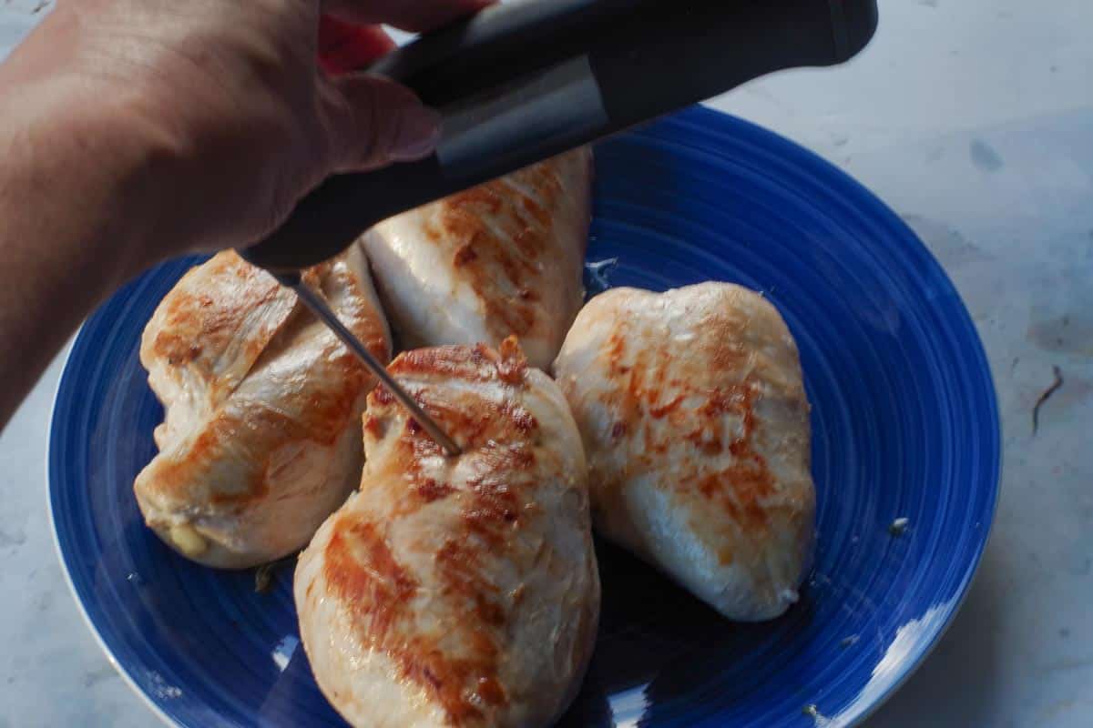 - Use a Digital Meat Thermometer. If you want juicy chicken, to ensure the chicken is perfectly cooked, use a digital meat thermometer. The chicken is ready when it reaches 165°F (74°C) in the thickest part.