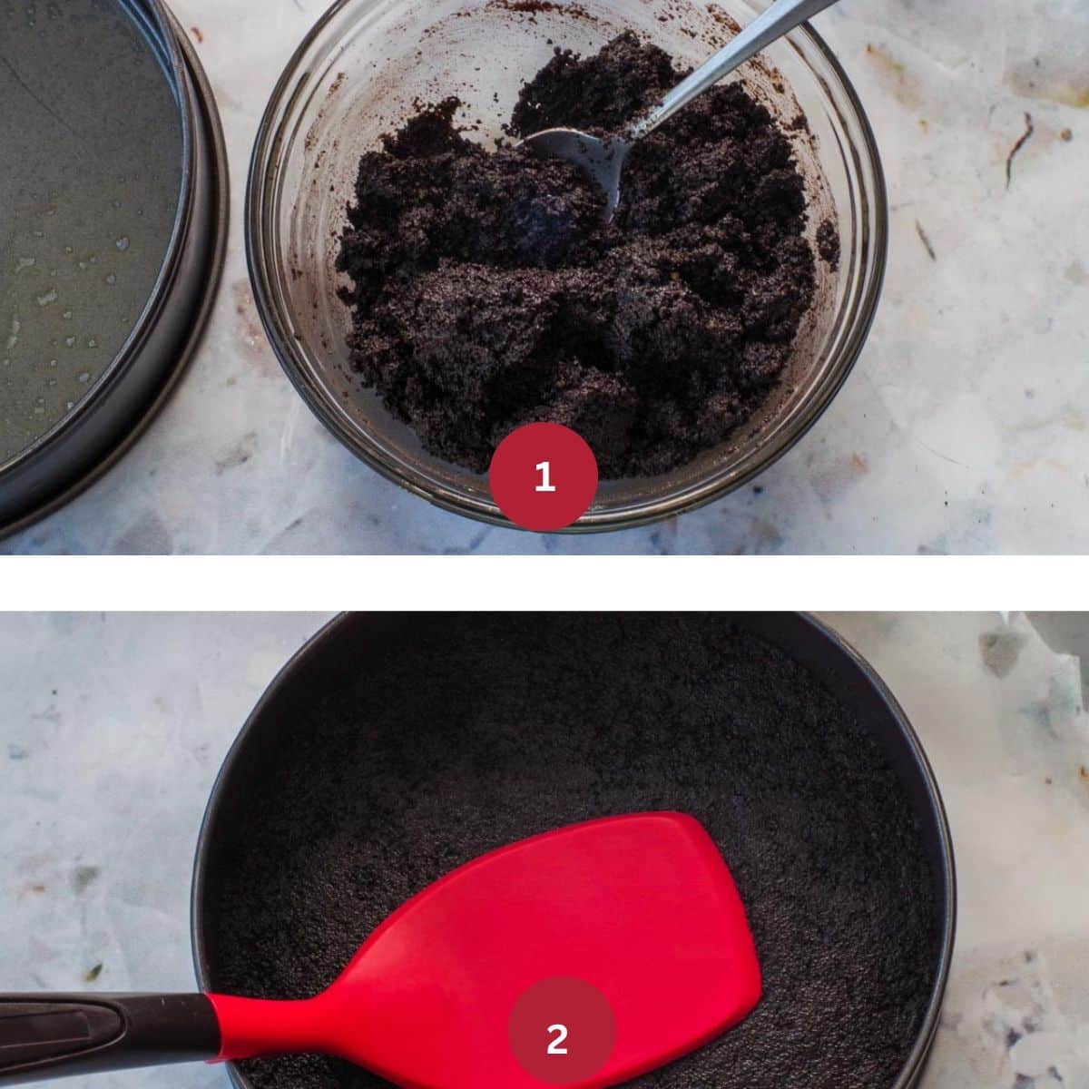 MAKE THE CRUST (STEP 1): In a medium bowl, combine chocolate baking crumbs and ⅔ cup melted butter and mix until all the crumbs are moistened and a thick, crumbly paste forms (Image 1). Press the mixture into the bottom of the springform pan. Level and press to the bottom of the pan using a rubber spatula (I use a flat silicone spatula turner) and neatly taper at the edge (Image 2). Cover the pan with plastic wrap and place in the fridge for 15 minutes.