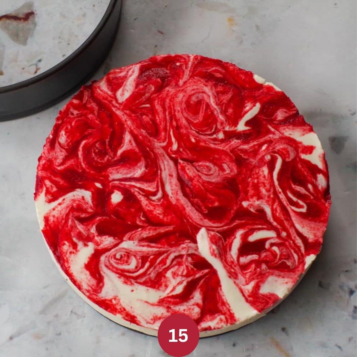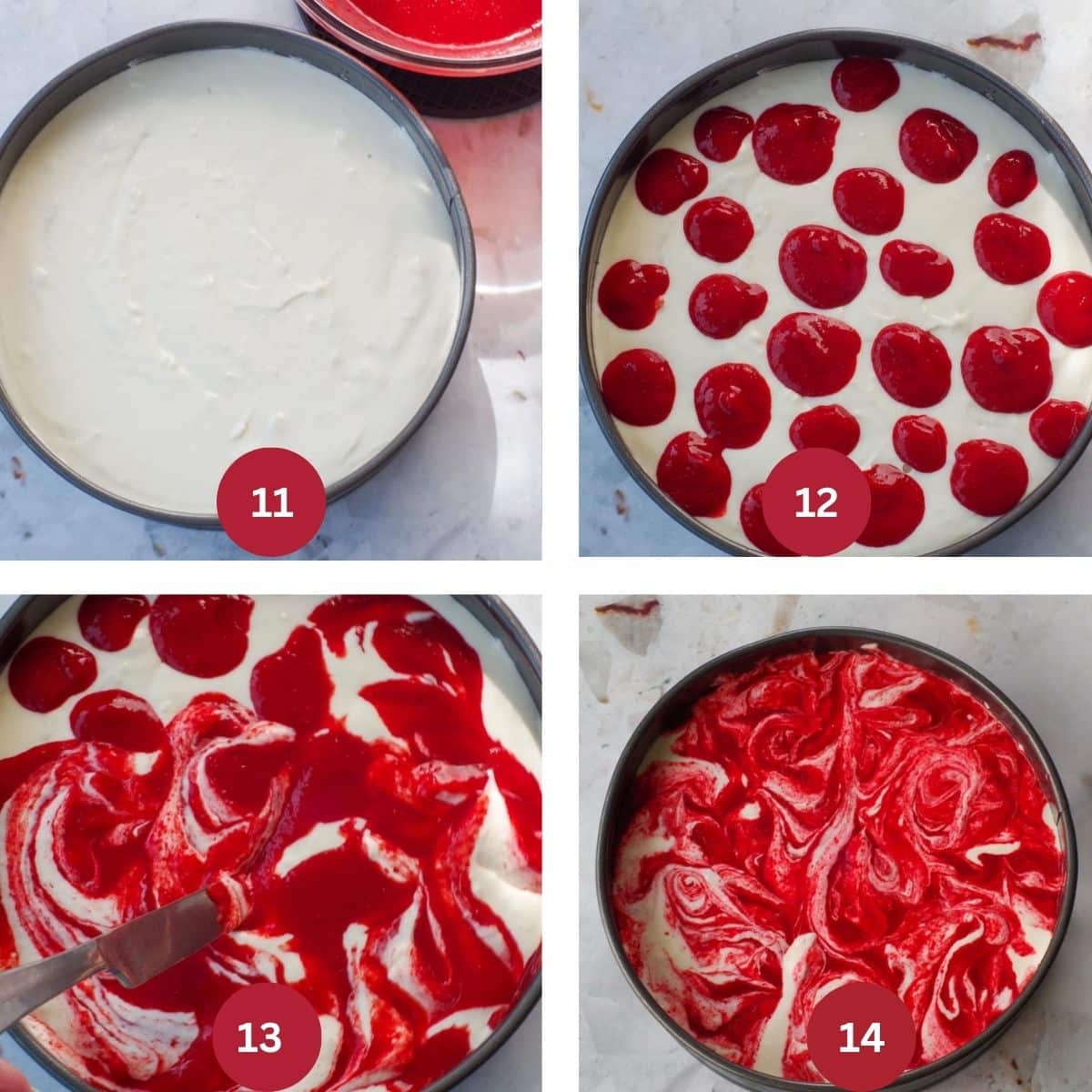 ASSEMBLY (STEP 4 ): Pour cheesecake batter into the springform pan with crust and level with a spatula. (Image 11). Drop several dollops of rhubarb and strawberry mixture onto the white cheesecake (Image 12) and swirl in with a butter knife (you may not need to use it all) (Image 13). Try to cut into it to get it deeper, but don't over-mix or it will lose the swirled effect (Image 14). Tap pan lightly against the counter to get rid of air bubbles. Cover with plastic wrap and refrigerate for at least 3 hours, but preferably overnight.