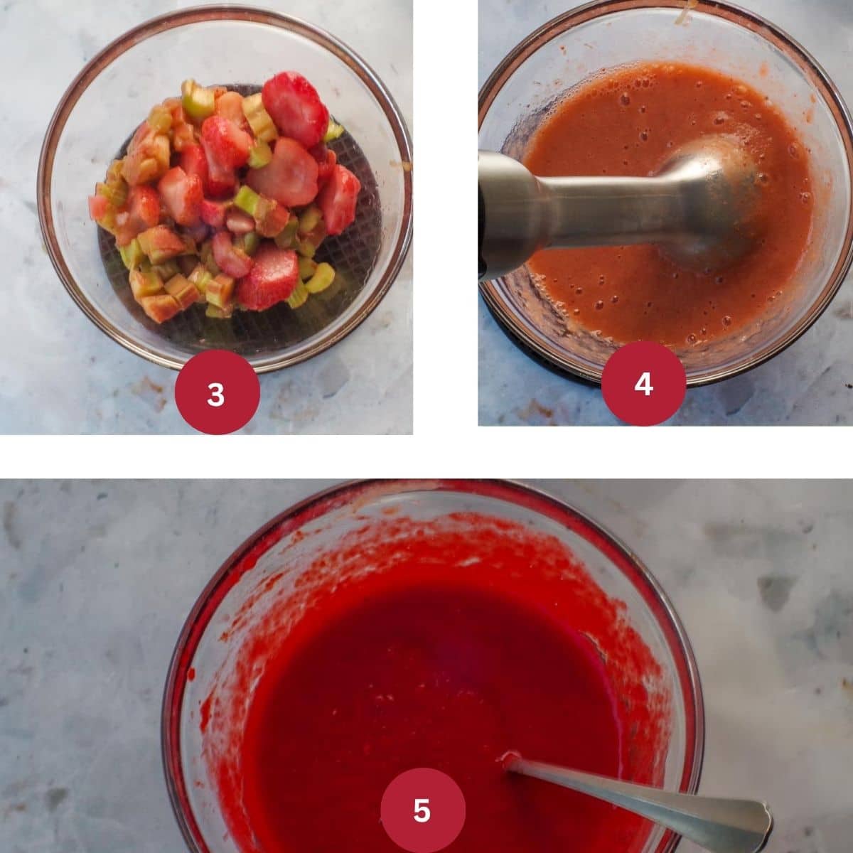 MAKE THE STRAWBERRY RHUBARB SWIRL (STEP 2): Cook the frozen rhubarb and strawberries in the microwave for 3 ½ minutes, then drain excess liquid (make sure you drain it well!) (Image 3). Puree rhubarb/strawberries for approximately 1 minute in a food processor or use an immersion mixer (shown) (Image 4). Add ground fennel and red gel food coloring (Image 5).
