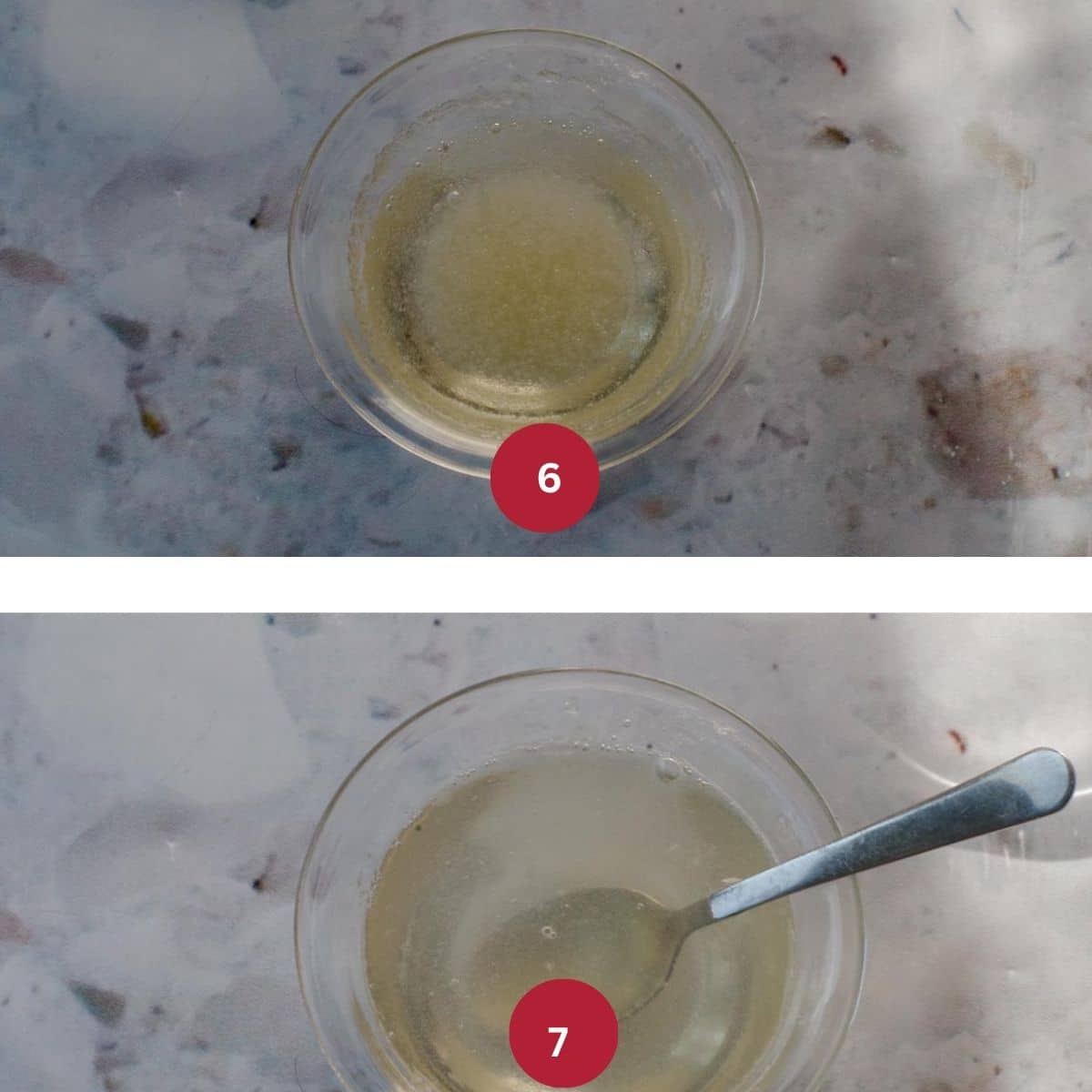MAKE THE FILLING (STEP 3 - PART 1): Mix gelatin crystals and ¼ cup warm water (only half the water) in a small bowl and allow to bloom for 5 minutes(Image 6). It will look like thick gel once it's bloomed. Heat the other ¼ cup of water for 30 seconds in the microwave on high and pour it into the gelatin bloom. Stir to dissolve, and it will become a liquid again. Allow to cool slightly (not hot to the touch) (Image 7).