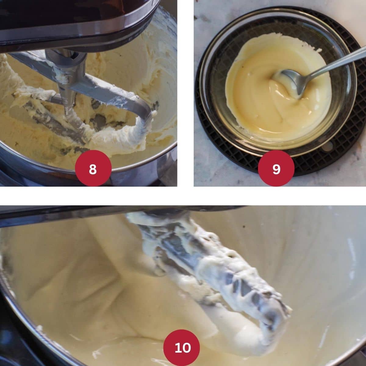 MAKE THE FILLING (STEP 3 - PART 2): Place cream cheese, 1 cup white granulated sugar in the large bowl of a stand mixer fitted with a paddle attachment (you can use a hand mixer and a large bowl). Mix on low to break down the cream cheese for 30 seconds, and increase to medium speed for another 1 minute (Image 8). Melt the white chocolate on 50% power in the microwave for up to 2 minutes, taking it out to stir at 1 minute, then at 30 second intervals- the heat from the melted chocolate helps to melt the unmelted chocolate pieces when you stir it, so only cook just as long as it needs. Alternatively, you can use a double boiler (Image 9). Scrape the sides of the bowl and add sour cream, whipping cream, Greek yogurt, and stir in white chocolate. Mix on medium for 30 seconds, scrape the sides, and on medium-high speed for 2 minutes, until smooth and fluffy. Starting on low, slowly pour gelatin into the cream cheese mixture. Continue to mix at medium speed for a minute, scraping the sides of the bowl after 30 seconds- don't overmix! (Image 10).