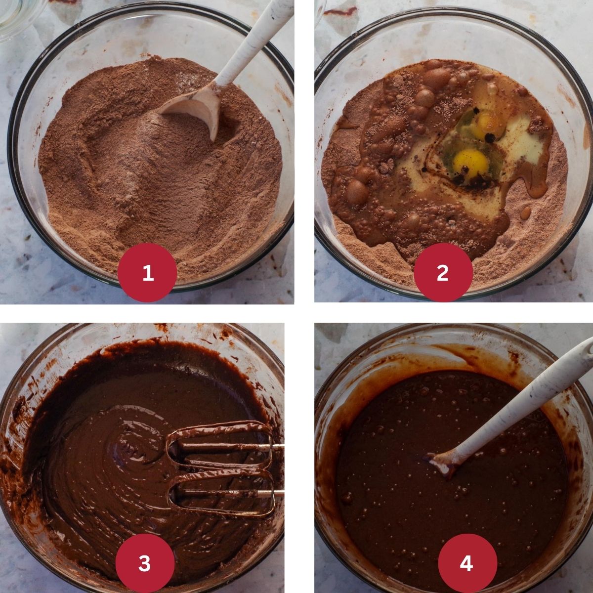 MAKE THE CAKE (STEP 1 ): In the bowl of a stand mixer (with paddle attachment), combine flour, white granulated sugar, cocoa powder, baking powder, baking soda, and salt (IMAGE 1). Add eggs, milk, oil, and root beer extract to the flour mixture (IMAGE 2). Beat on medium speed for 2 minutes (IMAGE 3). Slowly stir in boiling water and continue mixing for another minute or until combined (IMAGE 4).