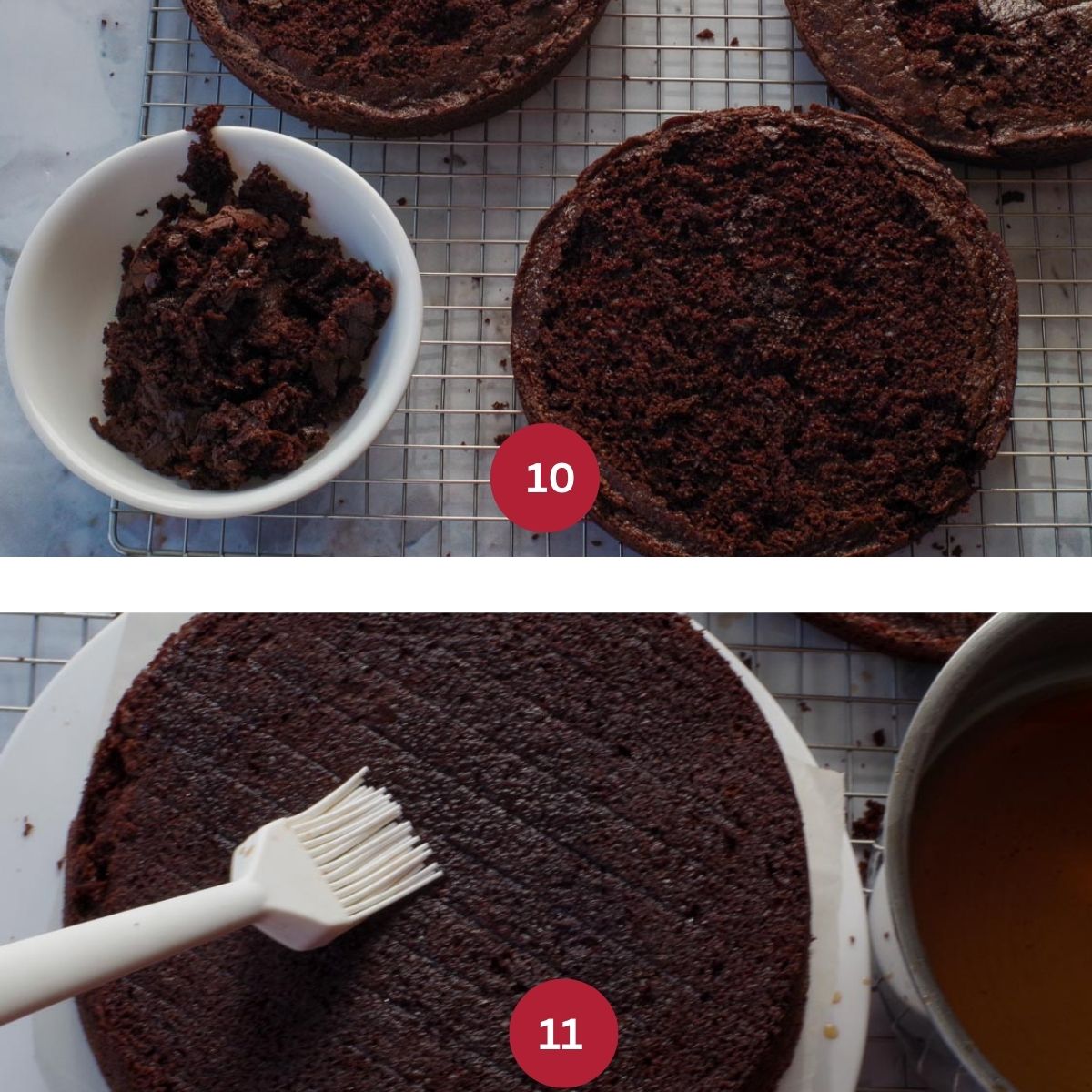 LEVEL THE CAKE AND ADD THE SYRUP (STEP 4): Level the cakes (cut off the dome) with a sharp knife or cake leveler (IMAGE 10). Brush cakes with root beer syrup/concentrate (IMAGE 11). Once cool, cover in plastic wrap (or place in a sealed container) and refrigerate for several hours or overnight. **This is not critical, but you do get the best results if you do this. Alternatively, if you are short on time, you can leave it in the fridge while you make the frosting, then decorate it.