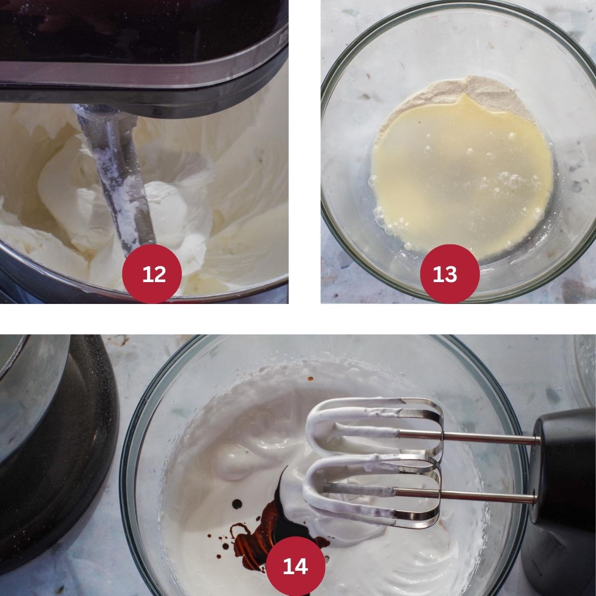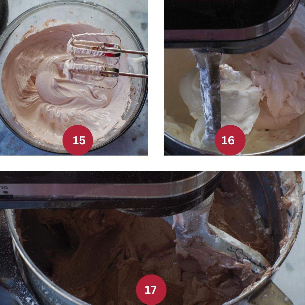 MAKE THE FROSTING (STEP 5- PART 2): Continue beating until combined (IMAGE 15). Combine both mixtures and beat together for another 8 minutes (IMAGE 16). The frosting will be very light and creamy. Add brown food coloring (IMAGE 17). Cover. DO NOT REFRIGERATE.