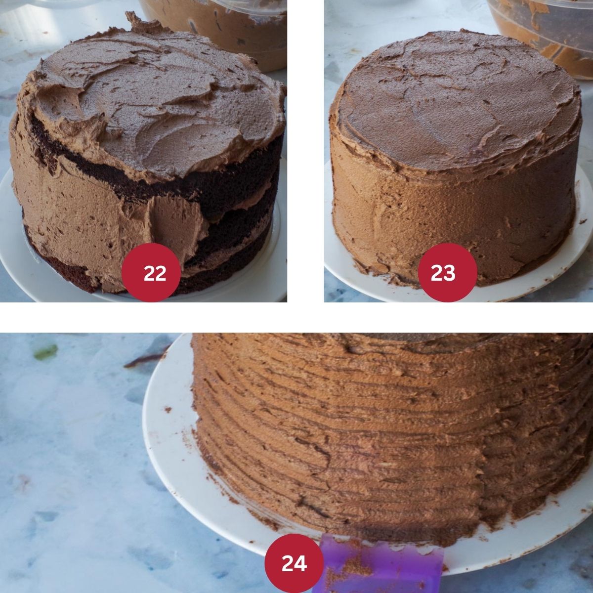 FROST THE CAKE (STEP 7): Brush off any loose crumbs with a pastry brush. Then add a thick layer of frosting to the cake using a cake decorating spatula (use a separate bowl for frosting you are working with so crumbs don't get into the whole batch). You could also do a crumb coat, then refrigerate it for a few minutes -see expert tips (IMAGE 22). Spread from the thickest part of the frosting outwards, to avoid getting crumbs in the frosting, and smooth it as much as possible - it helps to heat the spatula in hot water and dry it before smoothing the cake (IMAGE 23). Then run a cake comb along the sides of the cake. (see sample method in video). (IMAGE 24).