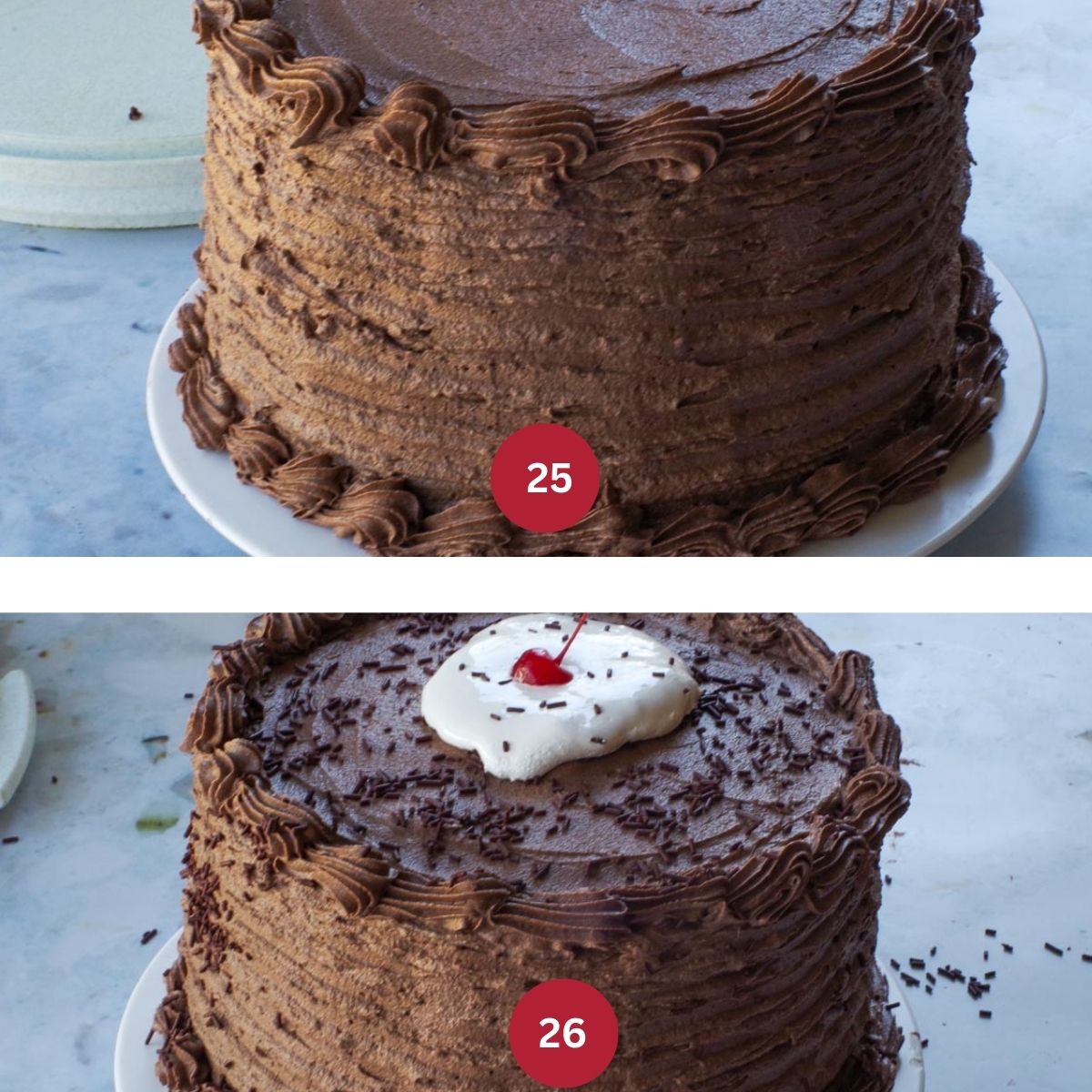 DECORATE THE CAKE (STEP 8): Pipe a border on top and along the bottom with a #21 frosting tip (the top border is optional) (IMAGE 25). Then add a dollop of the marshmallow creme (or fluff), then a maraschino cherry in the centre, and sprinkle with chocolate sprinkles. I simply toss the chocolate sprinkles at the sides of the cake (IMAGE 26). I recommend serving this cake with vanilla ice cream for the ultimate root beer float experience! You can also add a dollop of marshmallow creme and a cherry to each piece of cake.