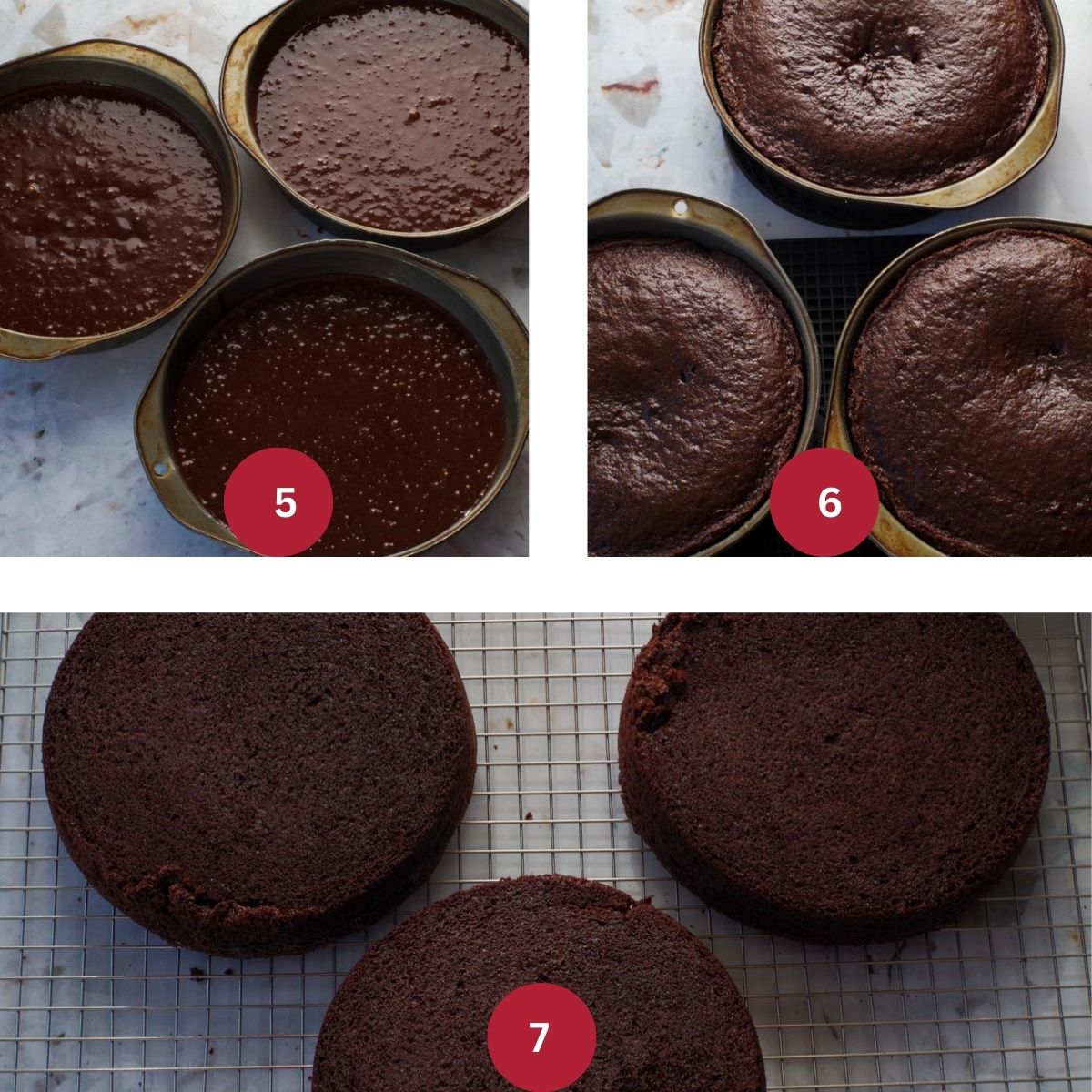 BAKE THE CAKE (STEP 2): Pour cake batter evenly into 3- 8-inch prepared cake pans until each cake pan is ⅔ full. **Batter will be a little runny (IMAGE 5). Bake cake for about 30 minutes or until a cake tester comes out clean and/or the center of the top of the cake springs back when lightly touched (IMAGE 6). *You can use baking strips so your cakes bake more evenly, but I find them a pain, so I just level the cakes after they cool. Let cakes cool for 10 minutes before removing from pans to finish cooling on a wire rack (IMAGE 7).