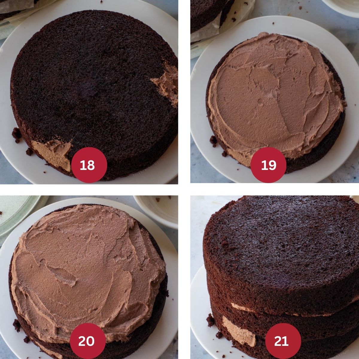 ASSEMBLE AND FILL THE CAKE (STEP 6): Transfer the first layer to a cake plate *If you have any holes or pieces that came off when you were removing the cakes from their pans, you can fix them with some frosting (to fill the gap or glue the piece back onto the cake) (IMAGE 18). Add frosting on top of the first layer of cake (IMAGE 19). Then add the second layer of cake and add frosting on top of that cake (IMAGE 20). Add the final layer cake (IMAGE 21).