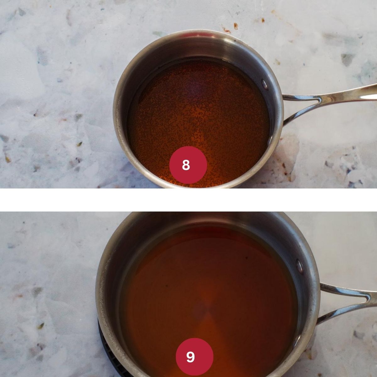 MAKE THE ROOT BEER SYRUP (STEP 3): While cakes cool, pour root beer into a saucepan (IMAGE 8). Boil root beer in a heavy saucepan until reduced by half. It will form a syrupy liquid. (IMAGE 9).