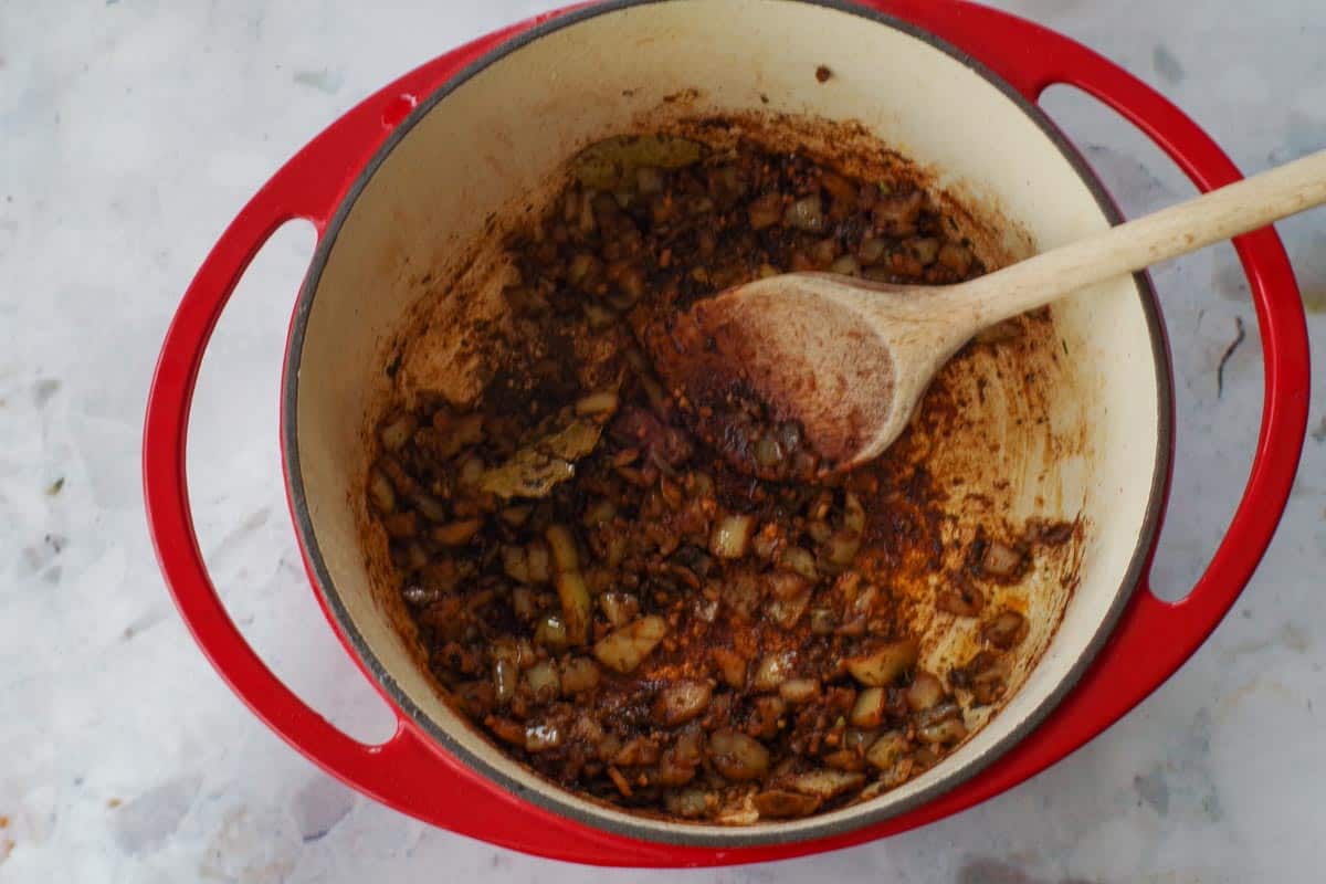 Step 4: Add onions, garlic, chili powder, cilantro, and bay leaves to Dutch oven/frying pan; cook, stirring often, until onions are softened, about 5 minutes.
