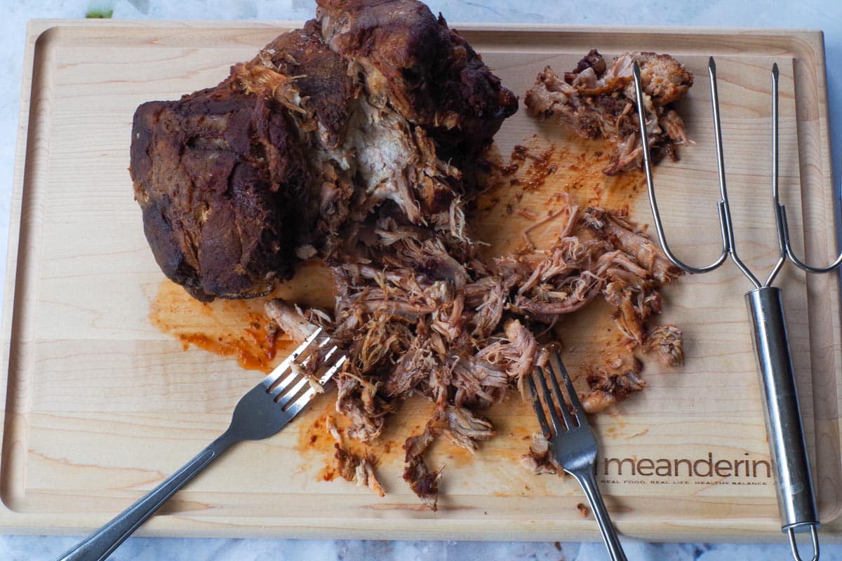 - Transfer pork to cutting board and when cooled for about 10 minutes, remove any fat and bone. With 2 forks, shred or "pull" pork. (See video on how to pull pork in notes)