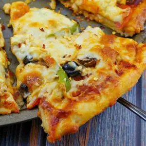 If you are worried that this WW 2 ingredient dough might be soggy, put those concerns aside. This dough is perfectly crispy and delicious! If you didn't know it was a ww pizza crust, you'd have no idea you were eating Weight Watchers pizza dough. The trick to keep ww pizza dough crispy is to use a perforated pizza pan (affiliate link). Another way to acheive a crispy crust is to bake it in a cast iron frying pan (affiliate link).