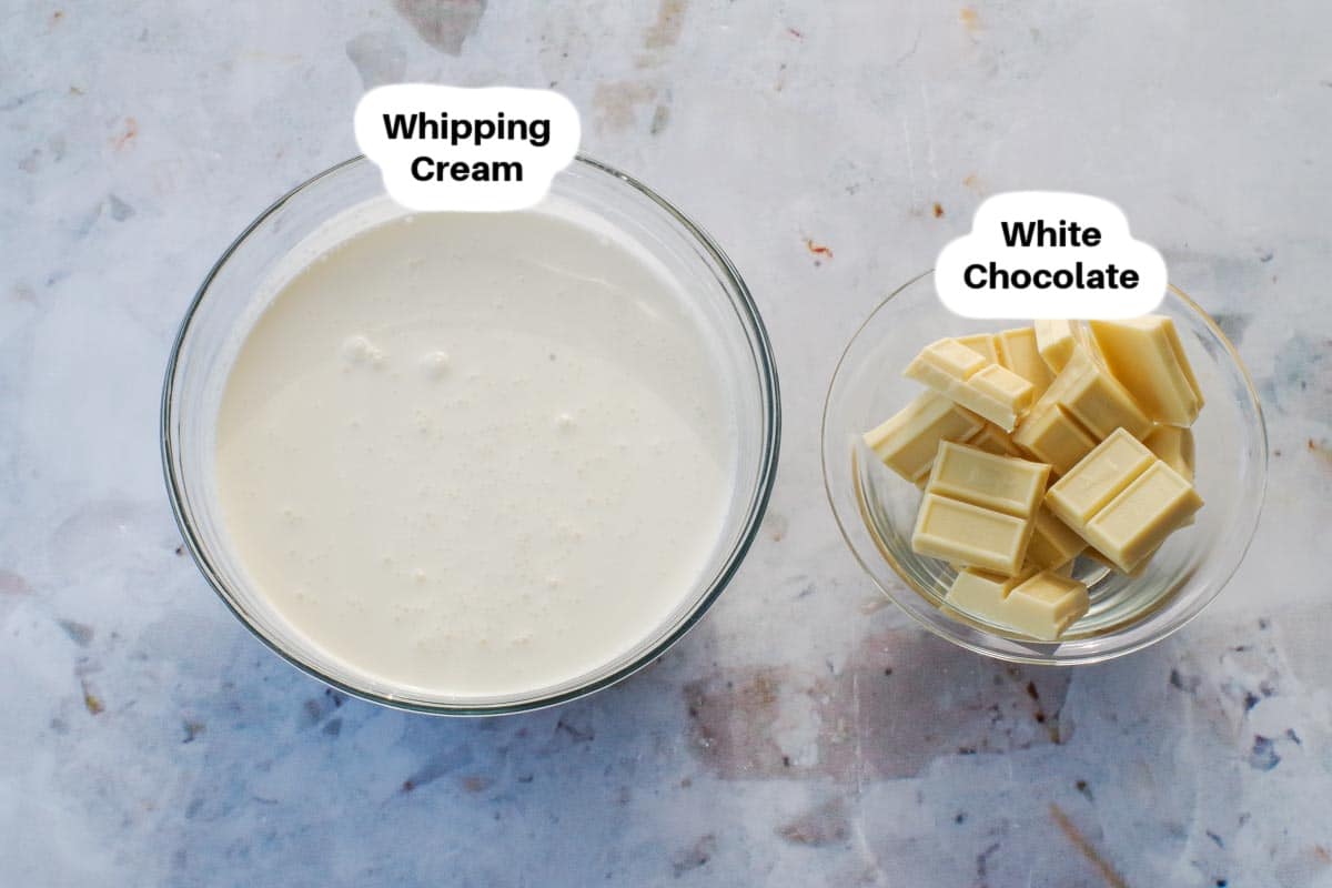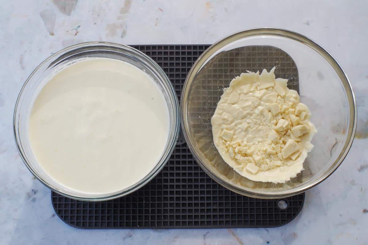- Add chopped white chocolate bars to a microwave-safe bowl and heat in the microwave at 50% power for 3 minutes. Heat the heavy whipping cream separately, in another microwave-safe bowl (at regular power), for 2-3 minutes or until warm. *Alternatively, you can do this in a double boiler1 litre whipping cream (35% -36% fat) / heavy cream