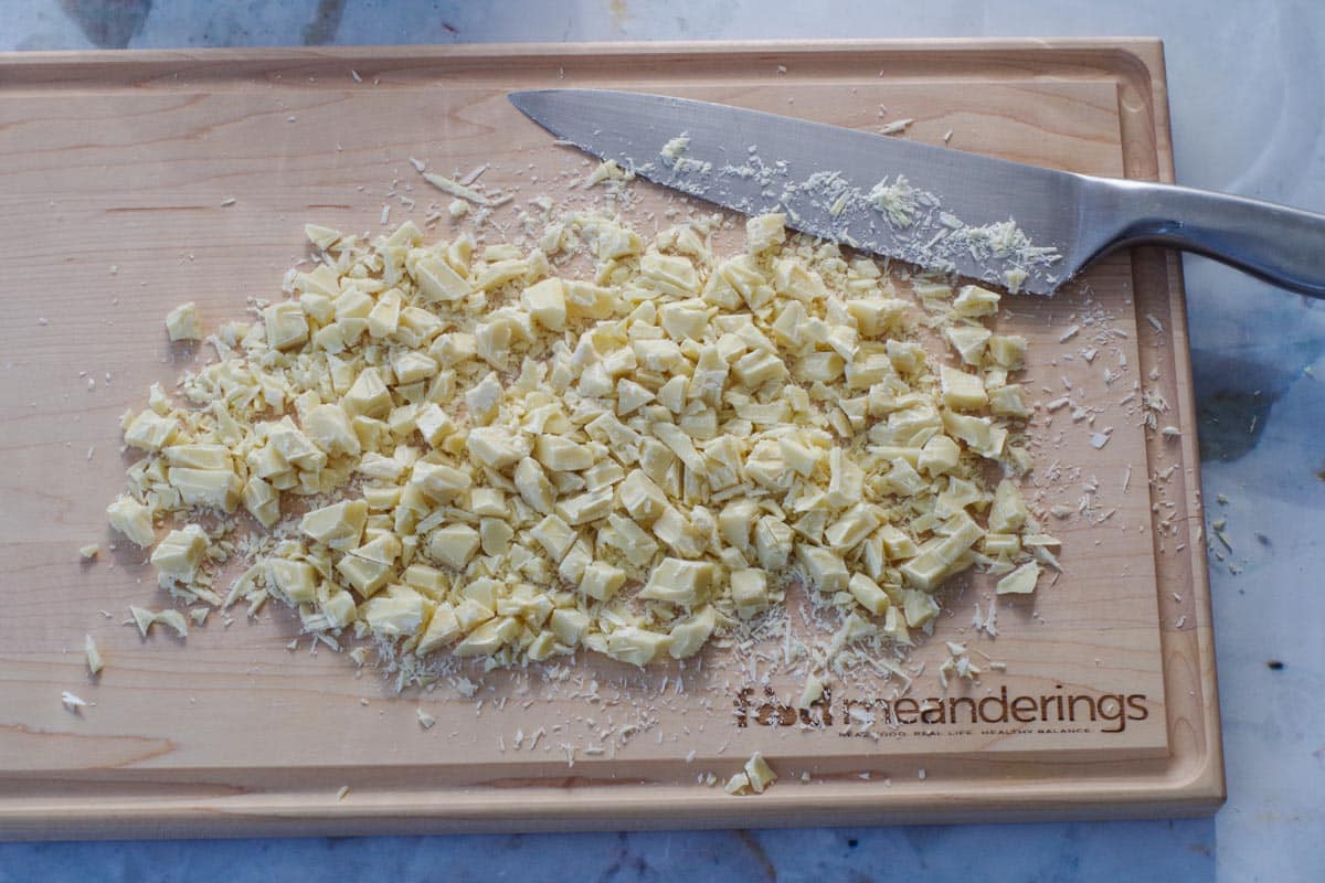 - Chop chocolate finely: The smaller you chop your white chocolate, the more evenly it will melt.